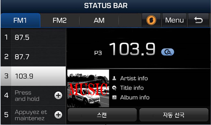 즉, 운전자가 차량 내 라디오나 AUX를 통해 흘러나오는 음악 정보를 알고 싶을 때 모니터 미디어 화면 우측 상단에 위치한 '사운드하운드' 로고를 누르면 해당 음원의 곡명, 가수, 앨범 정보를 나타내 준다.