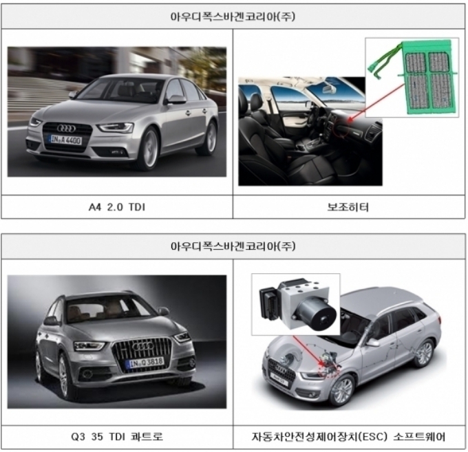 아우디폭스바겐코리아의 아우디 A4 2.0 TDI 등 13개 차종 4908대는 공조장치 내부 보조히터가 전기 커넥터의 결함으로 과열될 가능성이 발견됐다. 과열이 지속되면 보조히터가 작동하지 않거나 화재가 발생할 수도 있다.