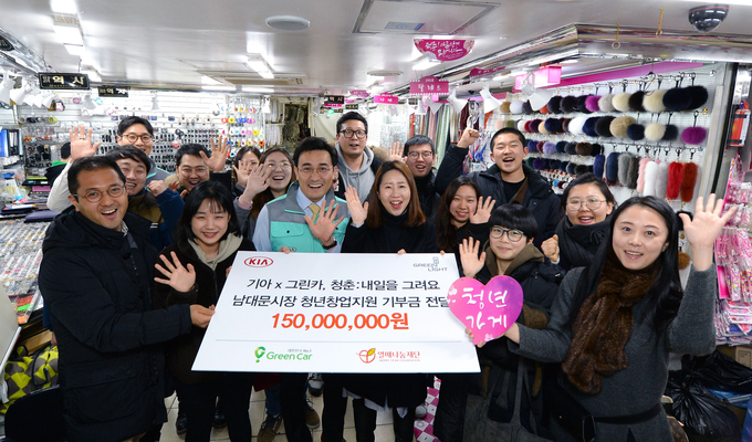 기아차는 21일남대문 시장 및 서울 중구 열매나눔재단 회의실에서 열매나눔재단 김추인 사무총장, 그린카 윤보경 마케팅기획팀장, 기아차 노계환 CSR경영팀장, 소상공인진흥공단 관계자 등 20여명이 참여한 가운데 ‘청춘, 내:일을 그리다’ 캠페인 기부금 1억 5천만원을 전달했다고 22일 밝혔다.