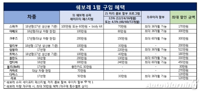 이달 중 2017년 생산분 스파크, 말리부, 트랙스를 구입하는 고객에게 100만원의 현금 할인이 제공되며, 주력 3차종에는 무이자 할부 및 최대 72개월 슈퍼 초장기 할부 프로그램이 적용된다. 72개월 슈퍼 초장기 할부를 통하면 스파크 월19만원, 트랙스 월29만원, 말리부는 월47만원에 구입할 수 있다.