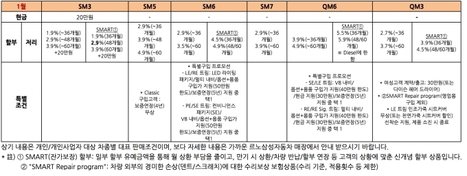 SM6와 SM3 2개 차종을 대상으로 하는 할부금리 인하 혜택도 제공된다. SM6는 일반 할부의 경우 2.9%(36개월), 3.5%(60개월)의 금리가 적용되며, 최대 60개월까지 가능한 스마트 잔가 보장 할부 프로그램이 함께 제공된다. SM3는 일반 할부 시 1.9%(36개월), 2.9%(48개월), 3.9%(60개월)의 인하된 할부금리 혜택이 적용되며, SM6와 마찬가지로 스마트 잔가 보장 할부 프로그램을 이용할 수 있다.