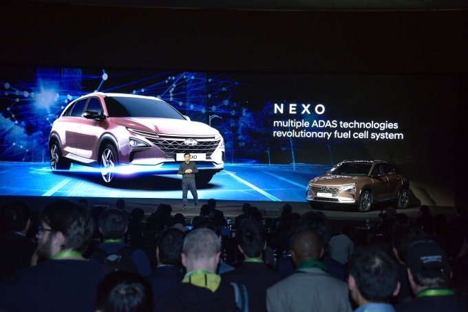 차명과 제원, 주요기술이 처음 공개된 현대자동차의 차세대 수소전기차 ‘넥쏘’는 차세대 동력인 수소연료전지시스템과 첨단 ADAS 기술 등이 적용됐다. 특히 5분 이내의 충전시간으로 세계 최고 수준인 590km 이상(인증 전)의 항속거리를 구현하는 등 현대차의 미래 기술력이 집대성됐다.