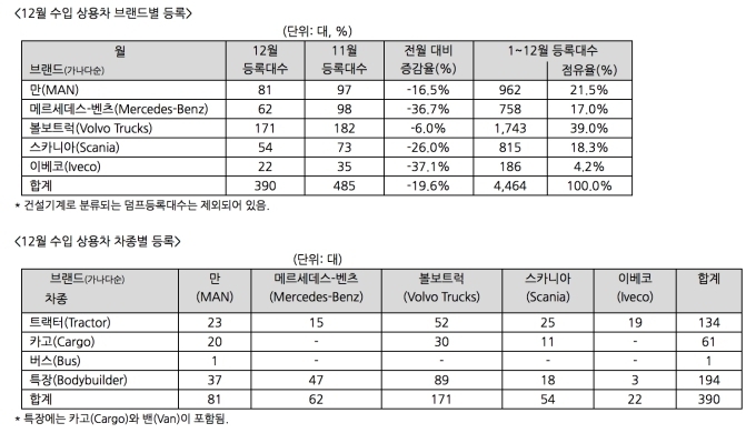 12월 판매에서도 볼보트럭이 171대로 제일 많았으며, 만(MAN) 81대, 메르세데스-벤츠 62대, 스카니아 54대, 이베코 22대로 뒤를 이었다.