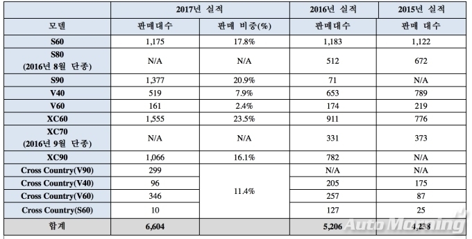 또 플래그십 라인업인 90 클러스터의 높은 인기가 성장에 큰 몫을 했다. 세단인 S90, SUV인 XC90, 크로스오버 모델인 크로스 컨트리가 각각 1377대, 1066대, 299대 판매됐으며, 전체 판매량 중 41.5%의 높은 비중을 차지했다.