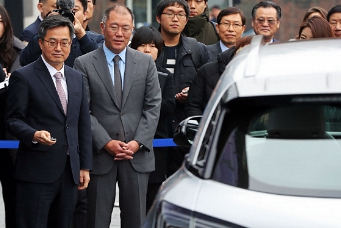 김 부총리는 이날 연구소에서 친환경차 국산 부품 개발 현황을 살펴보고 오는 3월 출시 예정인 신형 수소차 넥소에 탑승해 자율주행 기술을 체험했다.