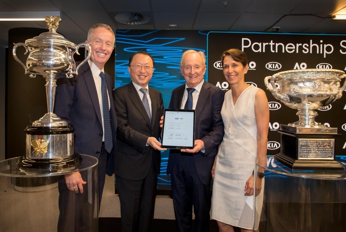 기아차는 27일(현지시각) 호주 빅토리아주에 위치한 멜버른 파크에서 기아차 및 호주오픈 관계자 등이 참석한 가운데 호주오픈 최상위 후원사 계약을 2023년까지 연장하는 '호주오픈 후원 계약 조인식'을 가졌다.