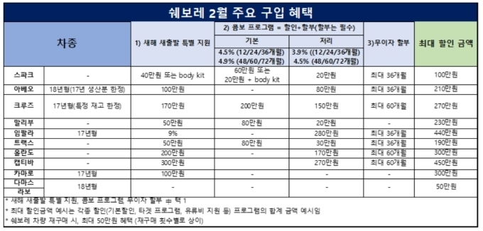 [오토모닝 정영창 기자] 한국지엠 쉐보레가 2월 ‘새해 새출발 특별 지원’ 프로모션으로 차종별 고객 할인 혜택을 강화한다.