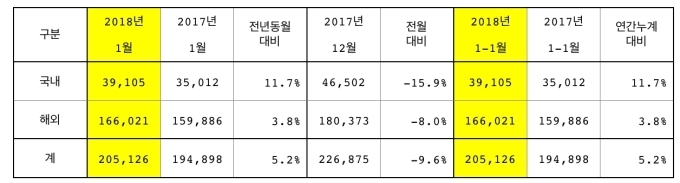 [오토모닝 정영창 기자] 기아자동차는 1월 국내 판매 3만9105대, 해외판매 16만6021대 등 글로벌 시장에서 총 20만5126대를 판매했다고 1일 밝혔다.