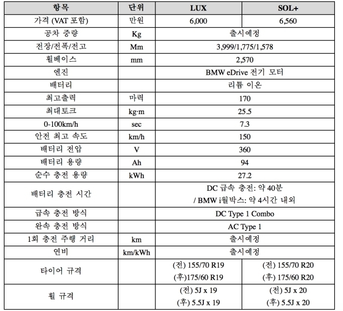 오는 3월경 국내 공식 출시 예정이며, 가격은 ‘뉴 i3 94Ah LUX’모델이 6000만원, ‘뉴 i3 94Ah SOL+’ 모델이 6560만원이며, 모든 모델에는 8년 또는 주행거리 10만km까지 배터리 품질이 보증 된다(VAT 포함).