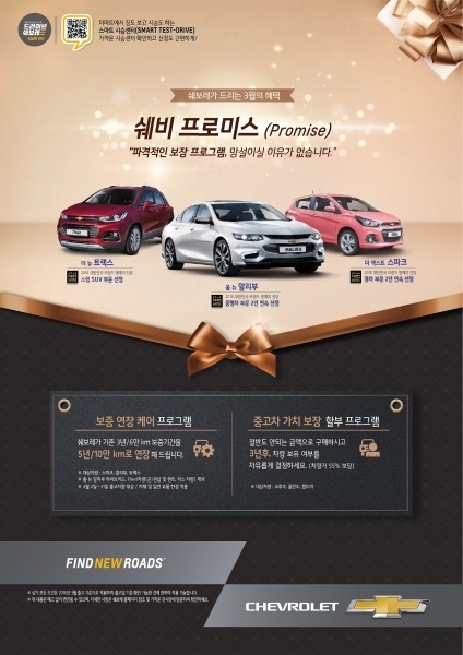 ‘쉐비 프로미스’ 프로그램을 통해서는 △스파크와 말리부, 트랙스의 기존 보증 기간에 2년을 추가 적용해 5년 또는 10만km까지 확대된 보증 서비스를 제공하며 △크루즈와 올란도, 캡티바의 3년 후 중고차 가치를 55%까지 보장하는 중고차 가치 보장 할부 프로그램을 제공한다.