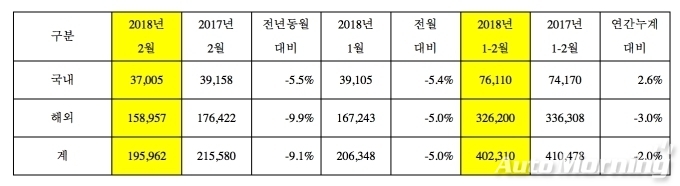 이는 전년 동월대비 국내 판매는 5.5%, 해외판매는 9.9% 감소했으며, 전체적으로 9.1% 줄었다. 설 연휴에 따른 근무일수 감소때문이다.