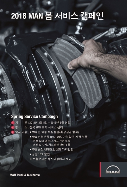 캠페인 기간 중 전국에 위치한 만트럭버스코리아 공식 서비스센터를 방문한 모든 고객에게 △전 차종 무상점검 서비스(특정 항목)를 비롯 △MAN 순정 필터 및 주요 사고 관련 부품, 엔진 및 샤시, 서스펜션 관련 부품 10~20% 할인 △MAN 순정 엔진오일 20% 할인 △공임비 10%의 할인 혜택을 제공한다. 단, 보험 수리는 대상에서 제외된다.