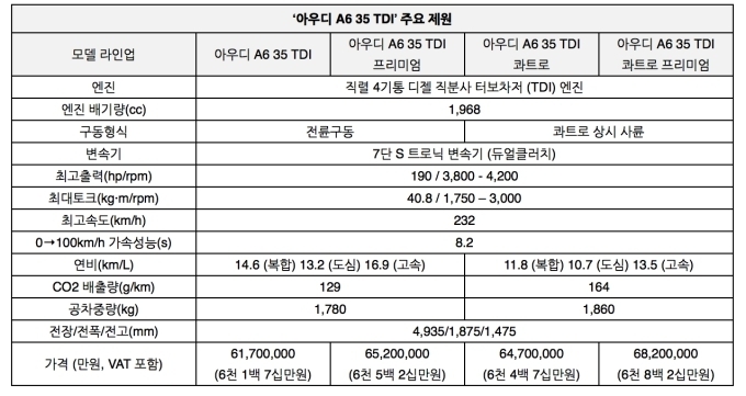 ‘아우디 A6 35 TDI’는 기본형, 프리미엄, 콰트로, 콰트로 프리미엄 총 4가지 라인으로 출시되며, 기본형과 프리미엄 라인의 연비는 복합연비 기준 14.6km/l (도심연비 13.2km/l, 고속도로 연비 16.9km/l)이다. 콰트로 및 콰트로 프리미엄의 연비는 복합연비 기준 11.8km/l (도심 연비 10.7km/l, 고속도로 연비 13.5km/l)이다.