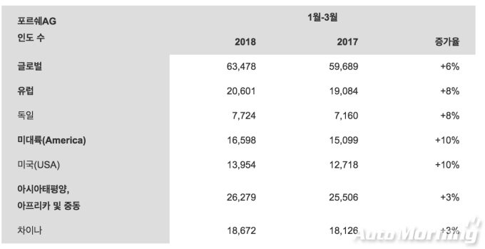 2017년에 이어 2018년 1분기에도 상승세를 이어간 포르쉐는 다시 한번 사상 최대 판매 기록을 자체 경신했다. 특히 미국, 유럽, 독일 시장에서 성장세가 두드러졌으며, 포르쉐 모델 중 신형 파나메라와 911 모델 라인이 수요를 견인했다.