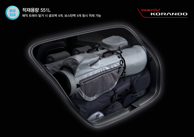 코란도의 동급최대 551ℓ(VDA, 독일자동차산업협회표준 기준) 적재공간은 매직트레이를 활용하여 다양하게 연출할 수 있다. 골프백 4개와 보스턴백(여행용 손가방) 4개를 동시에 수납 가능하고, 2단 매직트레이를 분리하여 주행 중에도 물건을 안전하게 보관할 수 있는 격벽으로 활용할 수 있다.