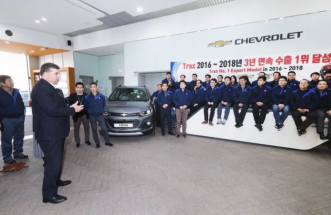 [오토모닝 정영창 기자] 한국지엠은 12일 부평 본사 홍보관에서 한국지엠 카허 카젬사장, 영업 및 서비스 부문 시저 톨레도부사장과 임직원이 참석한 가운데 쉐보레 트랙스를 포함한 글로벌 소형 SUV의 3년 연속 국내 완성차 수출 1위 달성을 축하하는 행사를 가졌다.