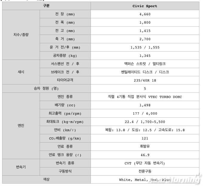 이외에도 조수석측 사각 지대를 확인할 수 있는 레인 와치(Lane Watch), 멀티 앵글 후방 카메라, 전자식 주차 브레이크&오토홀드, 차체 자세 제어 시스템, 코너링 자세 제어 장치, 경사로 밀림 방지 장치 다양한 안전 장치들을 탑재했다. ‘시빅 스포츠’는 기존 화이트, 블루 외에 신규 컬러인 메탈과 레드가 추가됐다.