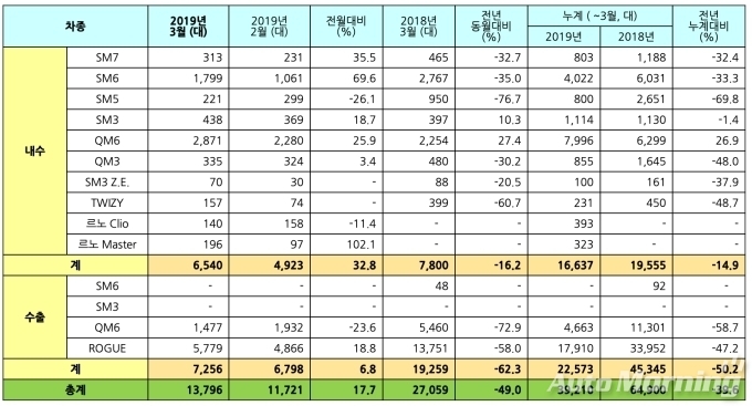[오토모닝 정영창 기자] 르노삼성은 3월 내수 6540대, 수출 7256대 등 총 1만3797대를 판매했다고 1일 밝혔다.