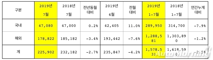 [오토모닝 정영창 기자] 기아자동차가 7월 글로벌 시장에서 국내 4만7080대, 해외 17만8822대 등 전년 동기 대비 2.7% 감소한 22만5902대를 판매했다고 1일 밝혔다.