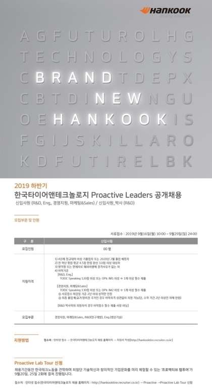 [오토모닝 정영창 기자] 한국타이어앤테크놀로지(이하 한국타이어)가 16일부터 29일까지 오토모티브 산업의 미래를 선도할 2019년 하반기 프로액티브 리더를 모집한다고 밝혔다.