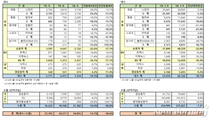 [오토모닝 정영창 기자] 한국지엠은 9월 내수 5171대, 수출 1만6222대 등 총 2만1393대를 판매했다고 1일 밝혔다. 이는 전년 동월 대비 내수판매는 30.4%, 수출은 40.8% 급감했고, 전체적으로 38.6% 줄었다.