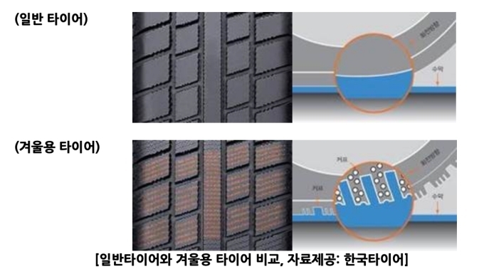 한국타이어가 제안하는 겨울철 안전운행 요령= 눈길이나 빙판길에서는 일반 노면보다 4~8배나 더 미끄럽기 때문에 급가속이나 급제동은 피해야 한다. 출발 및 운행 중 가속이나 감속도 천천히 해야 한다. 바퀴자국이 있는 눈길에서는 핸들을 놓치지 않도록 꽉 쥐어야 하고, 언덕길에서는 미리 저속으로 기어를 변속하는 것이 좋다. 또한 내리막길에서는 엔진브레이크를 사용해야 한다.