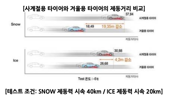 한국타이어앤테크놀로지가 진행한 테스트 결과에 따르면 눈길에서 시속 40km로 달리다 제동할 경우 겨울용 타이어는 제동거리가 18.49m에 불과한 반면 사계절용 타이어는 37.84m에 달하는 것으로 나타났다. 겨울용 타이어가 사계절용 타이어 대비 제동 성능이 약 두 배 이상 탁월했다. 빙판길 테스트(시속 20km에서 제동)에서도 겨울용 타이어는 사계절 타이어 대비 약 14% 짧은 제동 거리를 기록했다.
