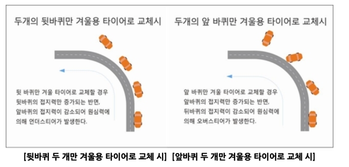 겨울용 타이어, 두 바퀴만 교체하면 안된다= 겨울용 타이어 교체 시 앞바퀴 혹은 뒷바퀴 두 개만 교체하는 경우가 종종 있다. 하지만 2개만 교체할 경우 오히려 더 위험할 수 있다. 예를 들어 앞 바퀴 두 개만 겨울용 타이어로 교체했을 경우 앞 바퀴의 접지력은 증가되는 반면, 뒷바퀴의 접지력은 낮은 상태가 되어 급격한 코너링 시 원심력에 의해 차선을 이탈할 수 있다.
