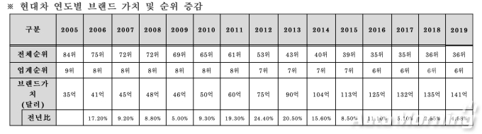 특히 현대차는 글로벌 경기 둔화 속에서도 4% 이상 성장이라는 높은 성장세를 기록했으며 2015년부터는 5년 연속으로 종합 브랜드 순위 30위권 진입에 성공했다.