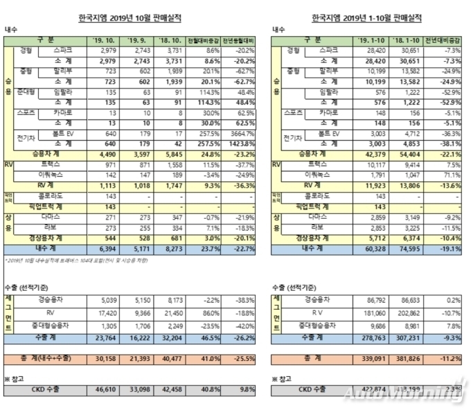 [오토모닝 정영창 기자] 한국지엠은 10월 내수 6394대, 수출 2만3764대 등 총 3만158대를 판매했다고 1일 밝혔다. 전년 동월 대비 내수판매는 22.7%, 수출은 26.2% 줄었고, 전체적으로 25.5% 감소했다.