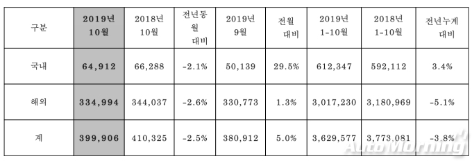 [오토모닝 정영창 기자] 현대자동차는 10월 국내 6만4912대 해외 33만4994대 등 전 세계 시장에서 총 39만9906대를 판매했다고 1일 밝혔다.