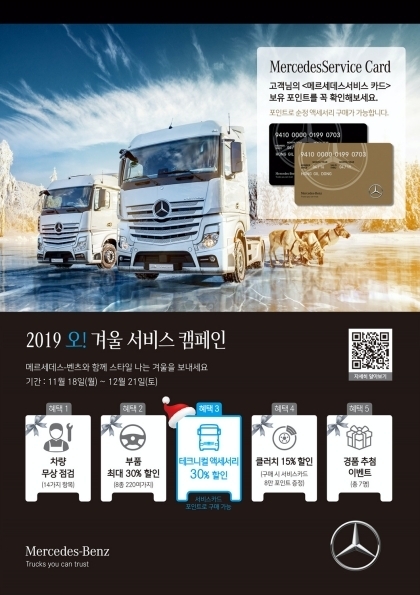 [오토모닝 정영창 기자] 다임러 트럭 코리아가 메르세데스-벤츠 트럭 고객들을 대상으로 18일부터 12월21일까지 전국 메르세데스-벤츠 상용차 공식 서비스센터에서 ‘2019 오! 겨울 서비스 캠페인’을 실시한다.