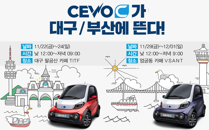 [오토모닝 정영창 기자] 캠시스가 이달 말 초소형 전기차 CEVO(쎄보)-C의 팝업스토어를 대구와 부산에서 열고, 고객대상 전시 및 시승 행사를 진행한다고 18일 밝혔다.