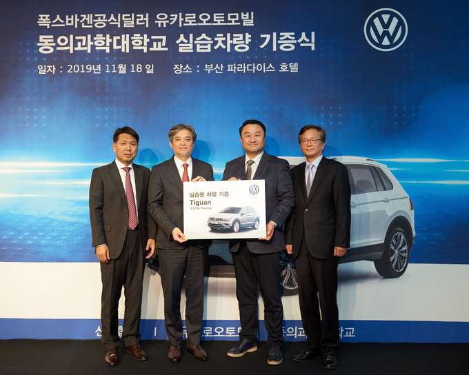 [오토모닝 정영창 기자] 폭스바겐코리아 공식딜러 유카로오토모빌이 지난 18일 부산 동의과학대에 티구안 2.0 TDI 프레스티지 차량과 실습 교재를 기증했다.