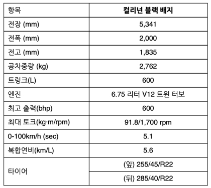 롤스로이스는 변속기 및 연료 조절판 성능도 맞춤 조정했다. 이에 따라 드라이브트레인, ZF 8단 기어박스, 전면부 및 후면 스티어 액슬이 가속 및 조향에 맞춰 작동 수준을 조절한다. 가격은 5억3900만원(VAT 포함)부터다.