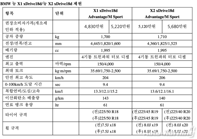 뉴 X1 xDrive18d와 뉴 X2 xDrive18d는 디자인 및 장비 옵션에 따라 어드밴티지와 M 스포츠 패키지, 2가지 트림으로 제공된다. 가격은 뉴 X1 xDrive18d 어드밴티지 모델이 4830만원, 뉴 X1 xDrive18d M 스포츠 패키지가 5220만원이며, 뉴 X2 xDrive18d 어드밴티지 모델은 5120만원, 뉴 X2 xDrive18d M 스포츠 패키지는 5680만원이다. (전 모델 부가세 포함, 개별소비세 인하 적용 가격)