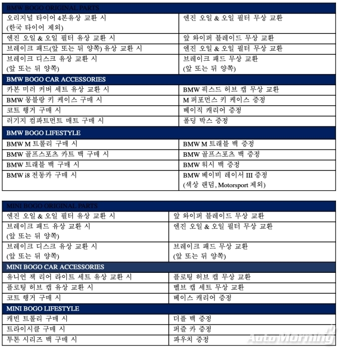 [오토모닝 정영창 기자] BMW 그룹 코리아가 16일부터 1월31일까지 7주간 전국 BMW와 MINI 공식 서비스 센터 및 라이프스타일 샵에서 ‘BMW/MINI BOGO(Buy One Get One) 캠페인’을 진행한다.