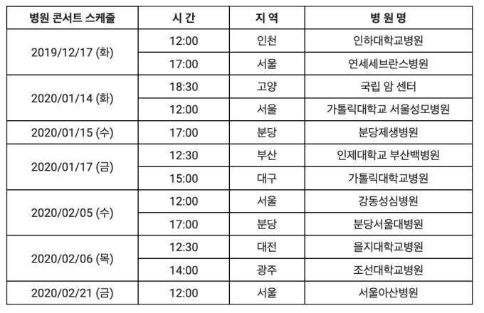 이번 토요타 자선 병원 콘서트에서는 KBS 교향악단 체임버(지휘 정주영, 최혁재)가 소프라노, 금관 오중주, 타악기 앙상블 등 다채로운 곡을 연주하며 개그맨 송준근과 정범균이 사회를 맡아 웃음을 선사할 예정이다. 이번 콘서트는 내년 2월 초까지 서울, 부산, 광주 등 전국 9개 도시, 12개의 병원에서 열린다.