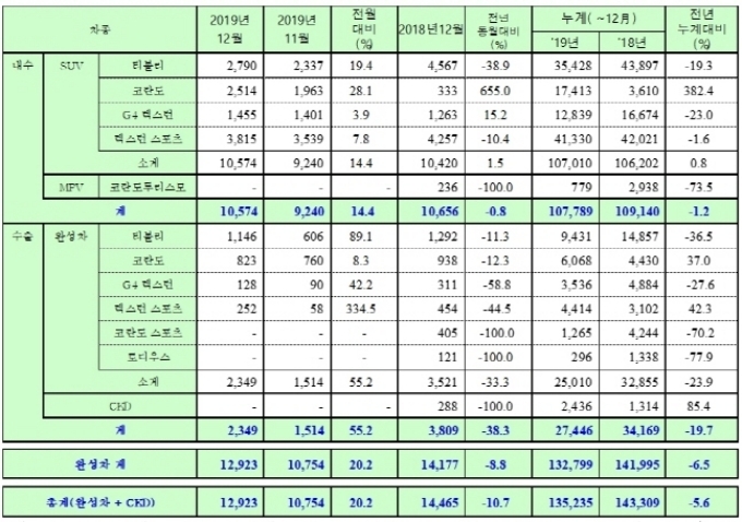 이는 전년 대비 내수 판매가 1.2% 감소했고 수출도 19.7% 줄어들면서 전체적으로 5.6%의 마이너스 성장을 기록했다. 코란도는 올 한 해 국내 시장에서 382.4% 증가한 1만7413대를 나타내며 국내 판매를 견인했다. 코란도는 9개월 만에 출시 첫달(3월 2202대) 실적을 넘어서는 등 12월에 월 최대 실적(2514대)를 기록하며 5개월 연속 상승세를 보였다.