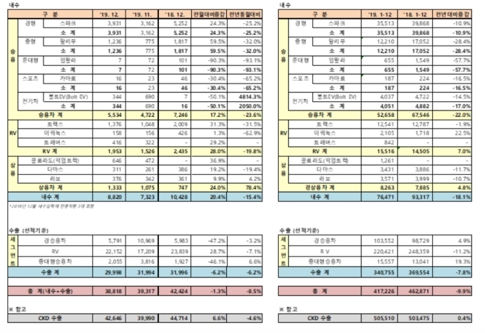 내수는 7만6471대로 전년보다 18.1% 줄었으며 수출은 34만755대로 전년보다 7.8% 감소했다. 특히 한국지엠은 12월 한달동안 내수 시장에 총 8820대를 판매하며 2019년 최대 월 판매 기록을 세웠다. 이는 전월 대비 20.4%가 증가한 것으로 한국지엠은 세 달 연속 두 자릿수 내수 판매 회복세를 이어갔다.