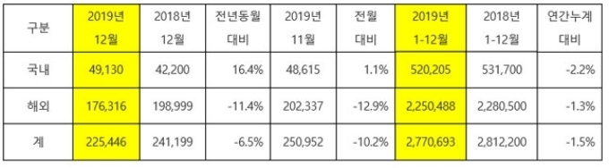 [오토모닝 정영창 기자] 기아자동차는 2019년 한해 동안 국내 52만205대, 해외 225만488대 등 전년 대비 1.5% 감소한 277만 693대를 판매했다고 2일 밝혔다.