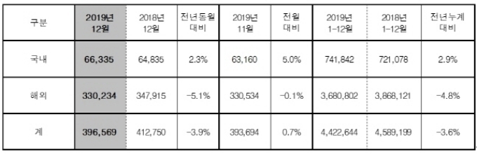 한편 현대차는 2019년 12월 국내 6만6335대, 해외 33만234대 등 전세계 시장에서 지난 2018년 보다 3.9% 감소한 39만6,569대를 판매했다. 이는 2018년 같은 기간과 비교해 국내 판매는 2.3% 증가, 해외 판매는 5.1% 감소한 수치다.