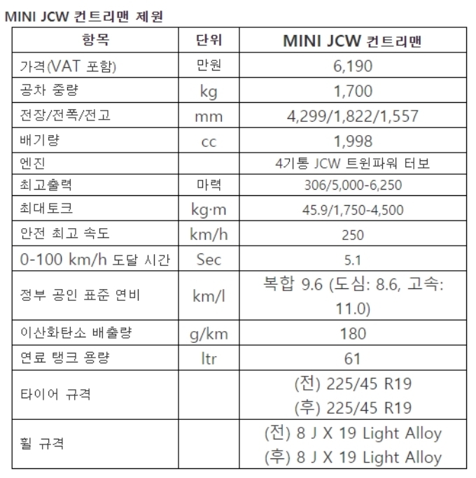 특히 이번 MINI JCW 컨트리맨에는 아이폰을 차량에 무선으로 연결해 다양한 기능들을 편리하게 이용할 수 있는 무선 애플 카플레이가 새롭게 적용된 것이 특징이다. MINI JCW 컨트리맨의 가격은 6190만원이다.