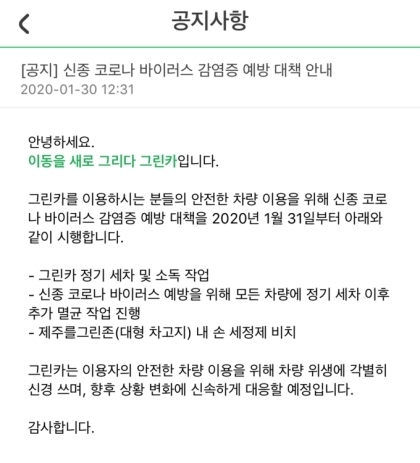 그린카 김상원 대표이사는 "신종 코로나 바이러스 확산 여파로 공유 모빌리티 이용에 불안감을 호소하는 고객을 위해 내부적으로 감염 예방 대책을 마련하고 엄격하게 시행할 예정”이라며 “공유 차량 이용자의 안전한 이동을 위해 상황 변화에 따른 신속한 지침 마련 및 대응을 준비하겠다”고 말했다.