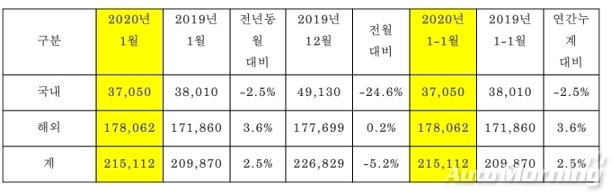 이는 전년 동월 대비 국내 판매는 2.5% 줄었지만 해외 판매가 3.6% 늘면서 전체적으로 2.5% 증가했다.