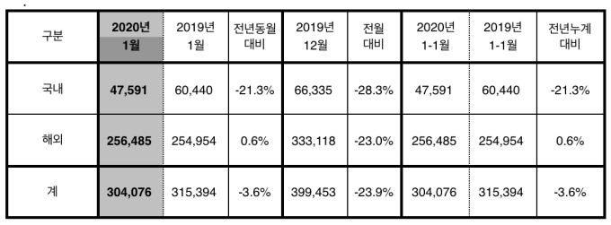 이는 전년 동월 대비 국내 판매는 21.3% 줄었으나 해외 판매가 0.6% 늘면서 전체적으로는 3.6% 감소했다.