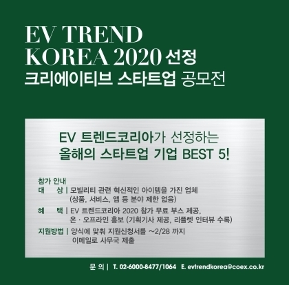 [오토모닝 정영창 기자] 대한민국 대표 전기자동차 전시회, ‘EV TREND KOREA 2020’은 혁신 모빌리티 기술 전시 및 홍보 지원 사업인 '크리에이티브 스타트업 BEST 5'에 참가할 기업을 오는 28일까지 공개 모집한다.