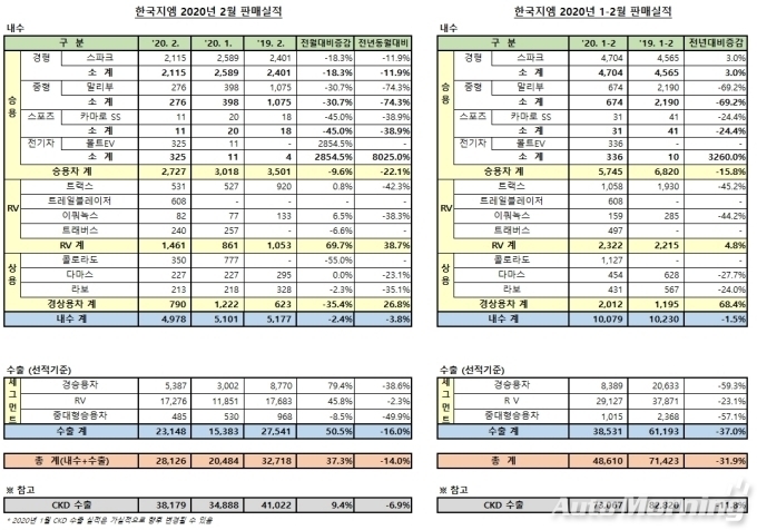 [오토모닝 정영창 기자] 한국지엠은 2월 한 달간 내수 4978대, 수출 2만3148대 등 총 2만8126대를 판매했다고 2일 밝혔다. 이는 전년 동월 대비 내수판매는 3.8%, 수출은 16.0% 줄면서 전체적으로 14.0% 감소했다.