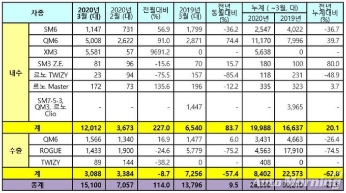 [오토모닝 정영창 기자] 르노삼성은 3월 내수 1만2012대, 수출 3088대로 총 1만5100대를 판매했다고 1일 밝혔다.