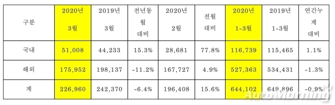 기아차 3월 해외 판매는 중국, 유럽, 북미 등 주요 시장이 신종 코로나바이러스 감염증(코로나19)의 영향으로 소비 심리가 위축되고 일부 해외 공장이 가동 중단되면서 두 자릿수 감소를 보였다.